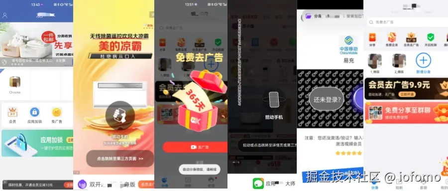然而会员功能不具备吸引力,因此以烦人的广告(自身启动广告,页面嵌入广告,分身应用启动广告,前后台切换广告等)骚扰免费用户成为付费会员,是大家常用的引流方式。