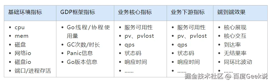 首先,GDP框架提供了一套基于Prometheus的标准化采集&监控解决方案,能极大降低传统日志采集+解析+监控配置+可视化的学习和管理成本,它定义了统一的指标规范,可由业务方按需调用接入。基于该标准化监控方案和业务核心诉求,我们建设了如下核心指标故障感知指标: