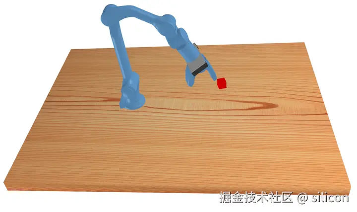再配个桌面,放个待抓取的小方块,给机器人换个颜色,效果如下: