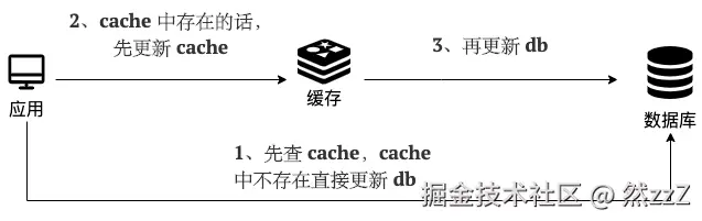 - cache 中存在,则先更新 cache,然后 cache 服务自己更新 db(同步更新 cache 和 db)。