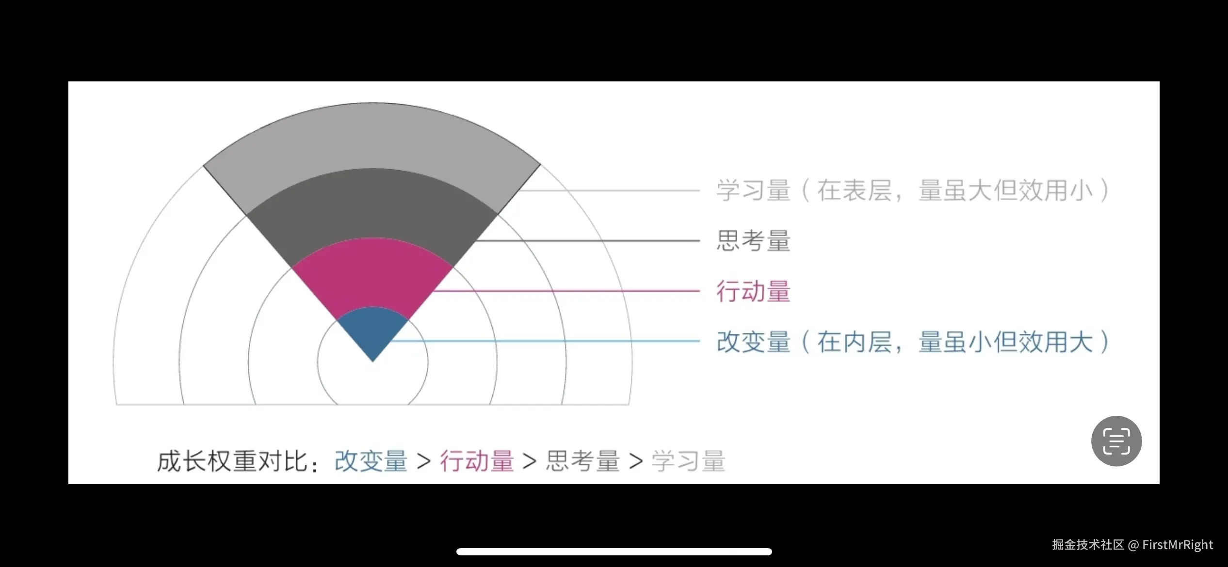 - 对于学习成长而言,成长权重对比是每个人都应该首先人士的,它揭示了“学习、思考、行动和改变”在成长过程中的关系:即对于学习而言,学习之后的思考、思考之后的行动、行动之后的改变更重要,如果盯不住内层的该变量,那么在表层投入再多的学习量也会事倍功半;因此,从权重上看,改变量>行动量>思考量>学习量。