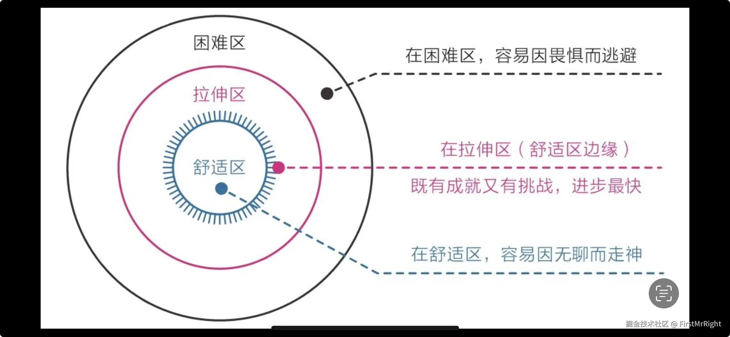 - 无论个体还是群体,其能力都以“舒适区-拉伸区-困难区”的形式分布要想让自己高效成长,必须让自己始终处于舒适区的边缘,贸然跨到困难区会让自己受挫,而始终停留在舒适区会让自己停滞(见图一)。
