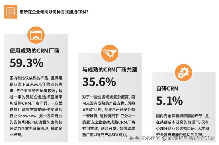 对于CRM的应用,调研显示,59.3%的企业倾向选择成熟CRM厂商产品,35.6%的企业倾向选择与成熟厂商共建,仅有5.1%的企业倾向选择自研。