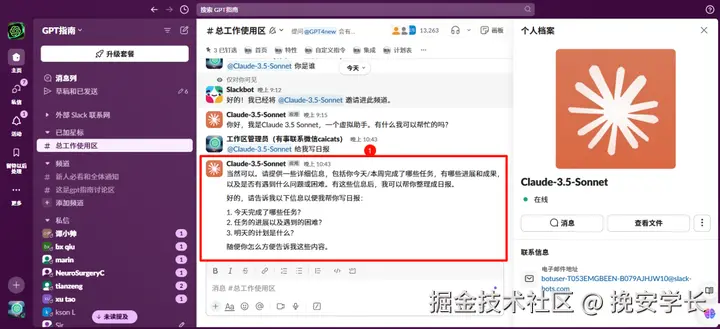 大佬通过API在Slack配置的一个应用,加入他的Slack工作区就能直接免费无限制使用Claude3.5模型、GPT4、GPT4o模型。目前Slack可以在电脑、手机、网页使用,可以说是很方便了。