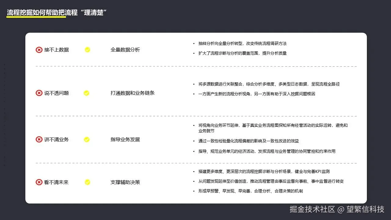 流程挖掘技术正是基于上述企业痛点应需而生的商用技术,望繁信科技作为国产流程挖掘企业的代表,结合流程挖掘产品、咨询、培训等,形成了强大的行业解决方案和最佳实践,为企业用户提供更贴近实际业务场景的一站式流程智能服务。