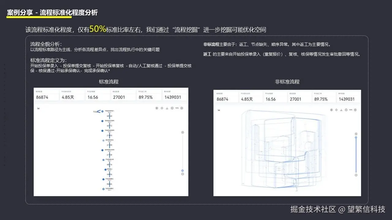 通过流程挖掘对真实执行流程的全面审视和细节深挖,我们能够发现大量交流不畅、权限及规则漏洞或者技术支持不足导致的资源浪费现象,仅仅是其中一个环节的优化,就为企业创造了三百万元+的真实收益。