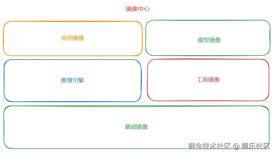 镜像中心, 目标是为昇腾以及openMind用户提供常用的镜像,使用基础镜像为底座,根据不同业务需求、用户场景分层堆叠,满足于全场景需求,保证基础归一,底座同源,包括推理引擎、工具镜像、应用镜像、模型镜像。