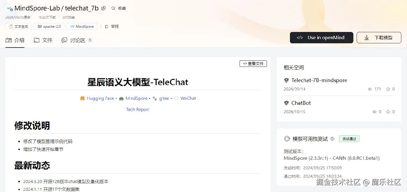 下图展示了 telechat_7b 模型的测试结果,显示“测试通过”,如果测试失败,可以下载测试日志,分析定位后重新进行测试。