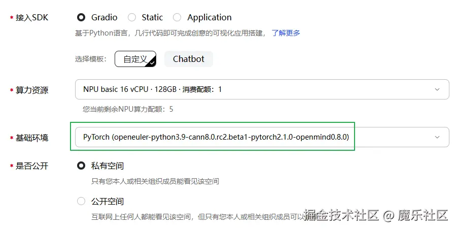 - 当用户选择 PyTorch (openeuler-python3.9-cann8.0.rc2.beta1-pytorch2.1.0-openmind0.8.0) 基础环境,对应的基础镜像就是 registry.modelers.cn/base_image/openmind:openeuler-python3.9-cann8.0.rc2.beta1-pytorch2.1.0-openmind0.8.0
