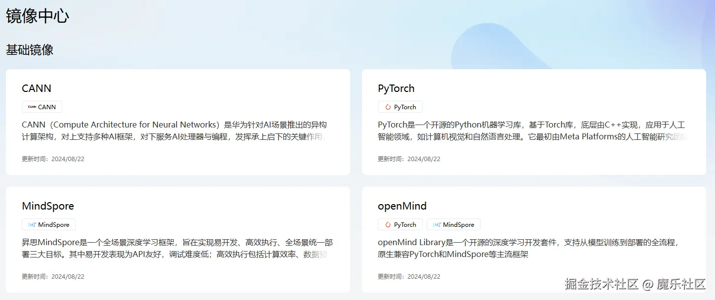 - 镜像中心:镜像仓库,为昇腾以及openMind用户提供常用的镜像,快速构建和部署AI应用,或进行二次开发。