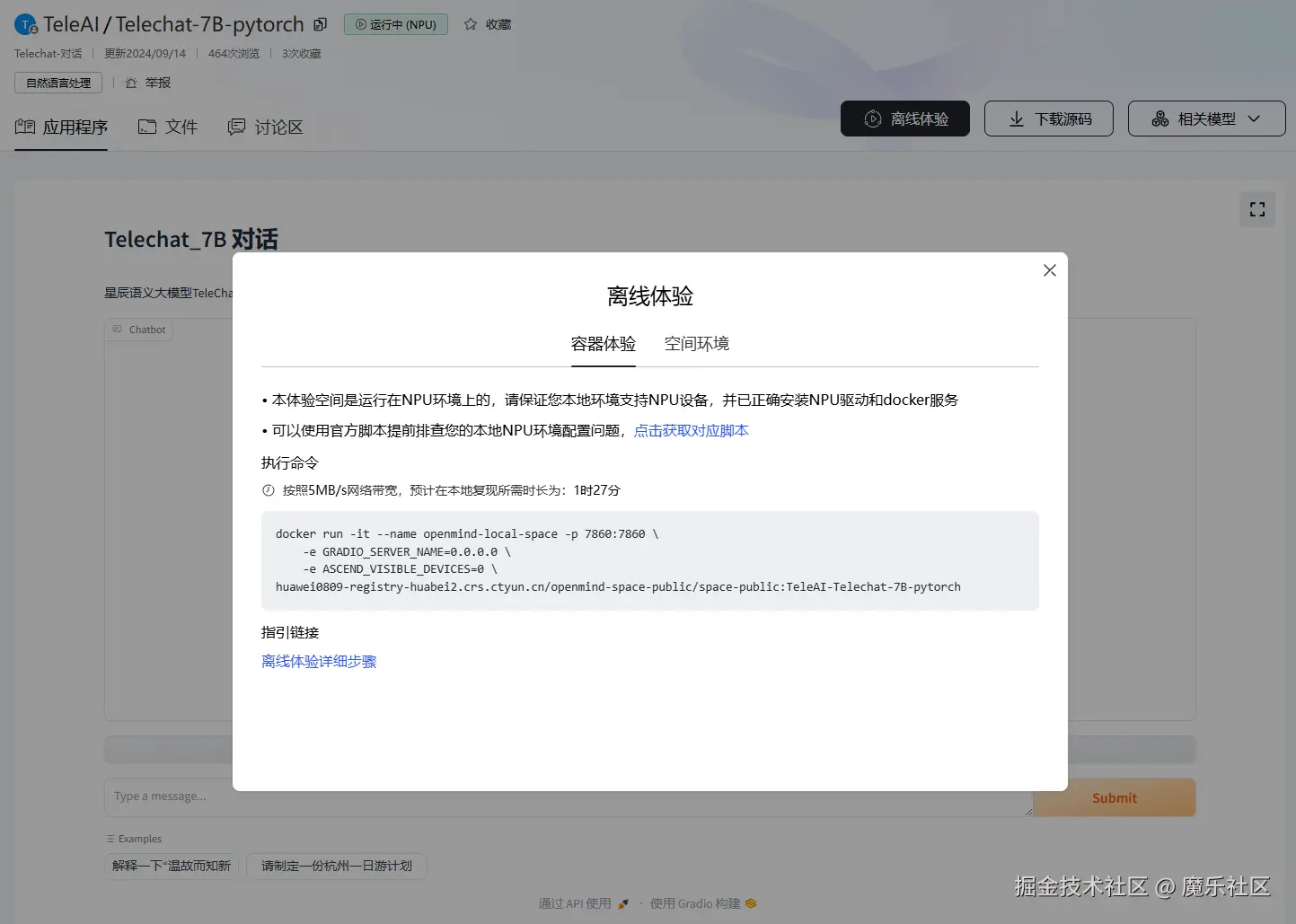 体验空间镜像是对外可获取的,点击离线体验,本地执行docker命令,就会创建与在线体验一致的服务,可以自由迁移到任意环境上。