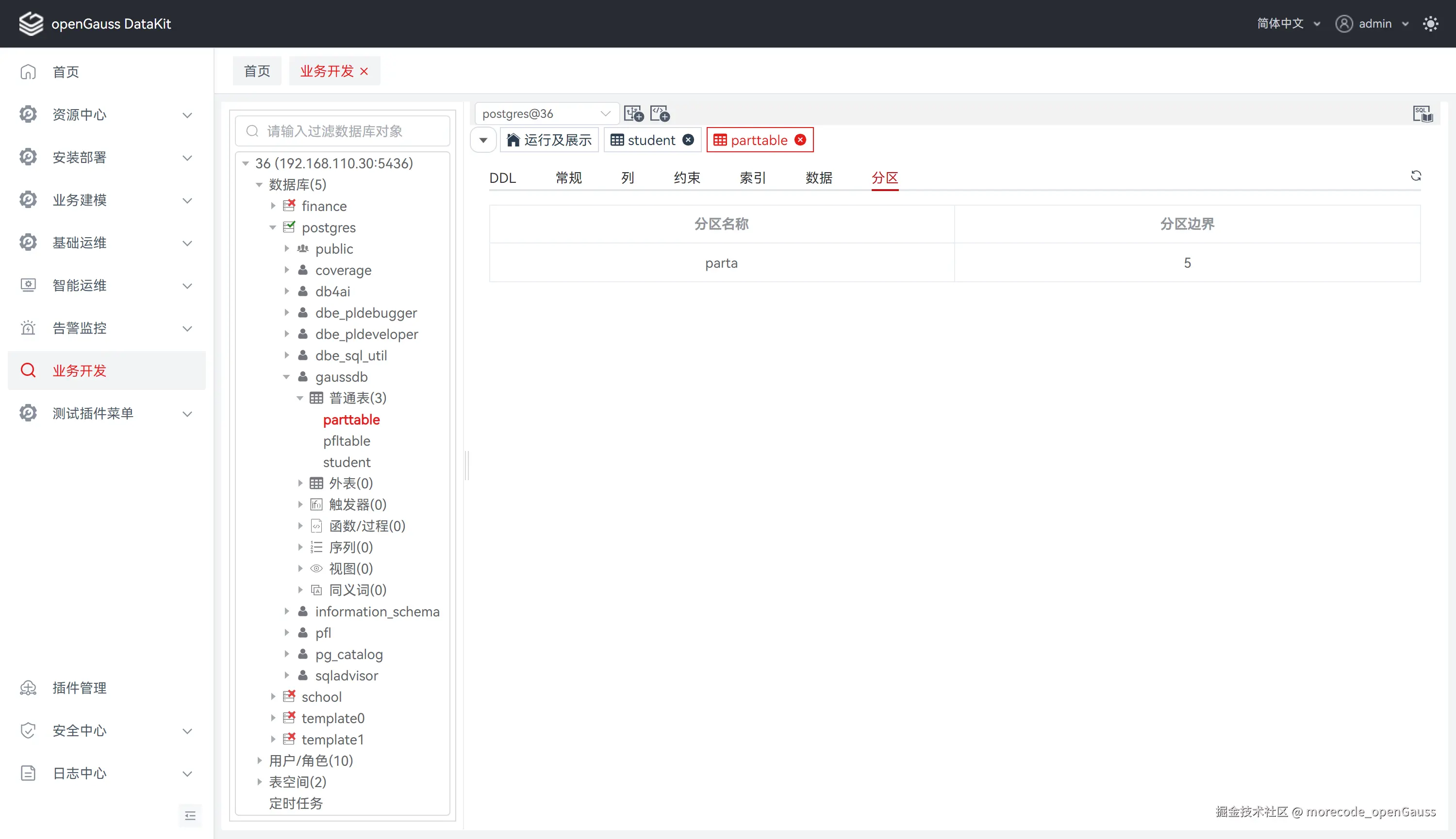 步骤 1: 在 “数据库导航菜单” 窗格中,单击普通表列表,若所选表为分区表,将显示分区属性,选中 “分区"。