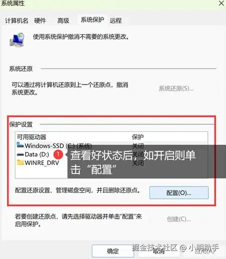 点进电脑的“设置”,找到 “系统还原”功能后点击“创建还原点”;查看电脑文件保护功能的状态后,如显示“已开启”,则点击“配置”后,在新页面按照提示继续操作。