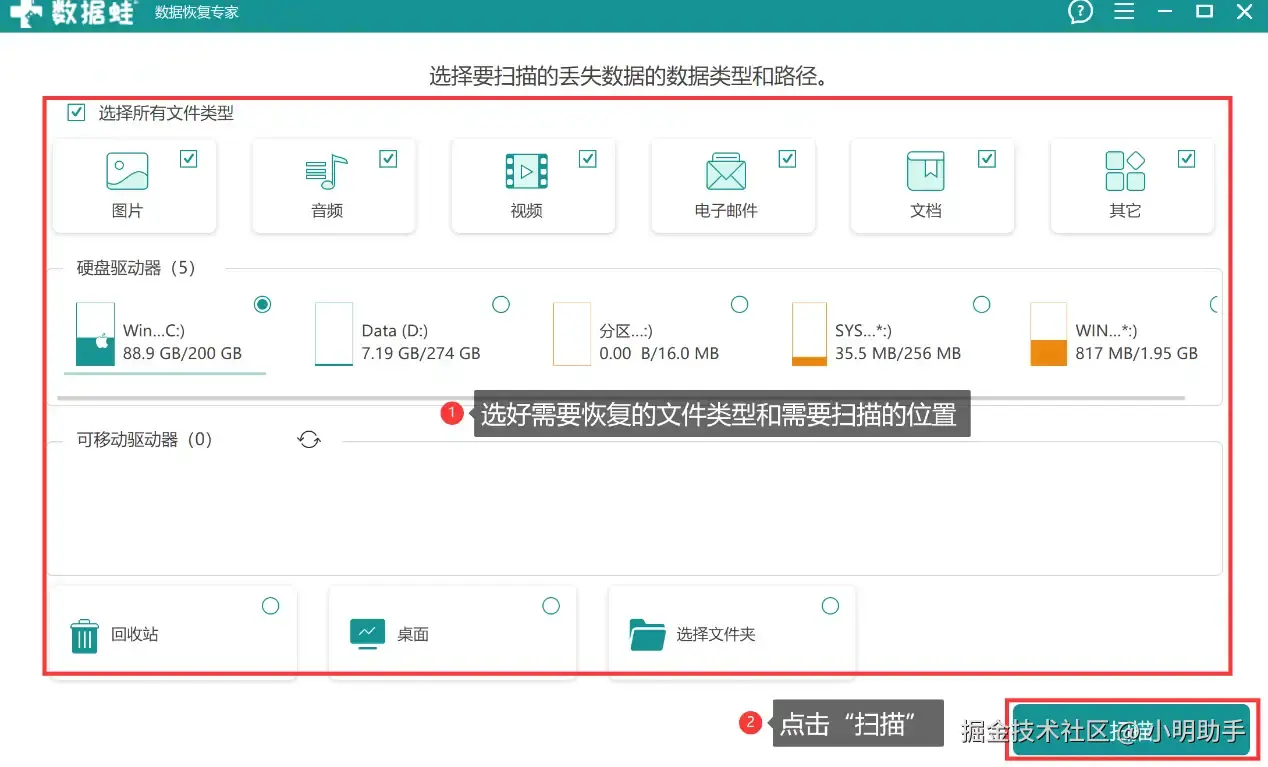 第1步: 打开数据 蛙恢复专家,在弹出的注册页上点击“免费试用”后进入主页面,勾选需要恢复的文件类型和扫描位置,点击“扫描”。
