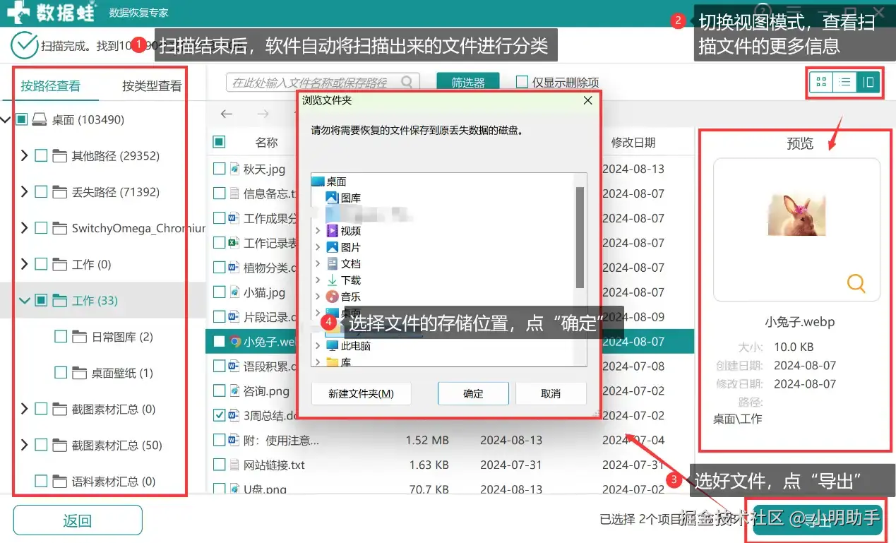 第2步: 等待扫描结束后,选择自己需要恢复的文件后点击“导出”,然后再“浏览文件夹”的弹窗上选择恢复文件的存储位置。