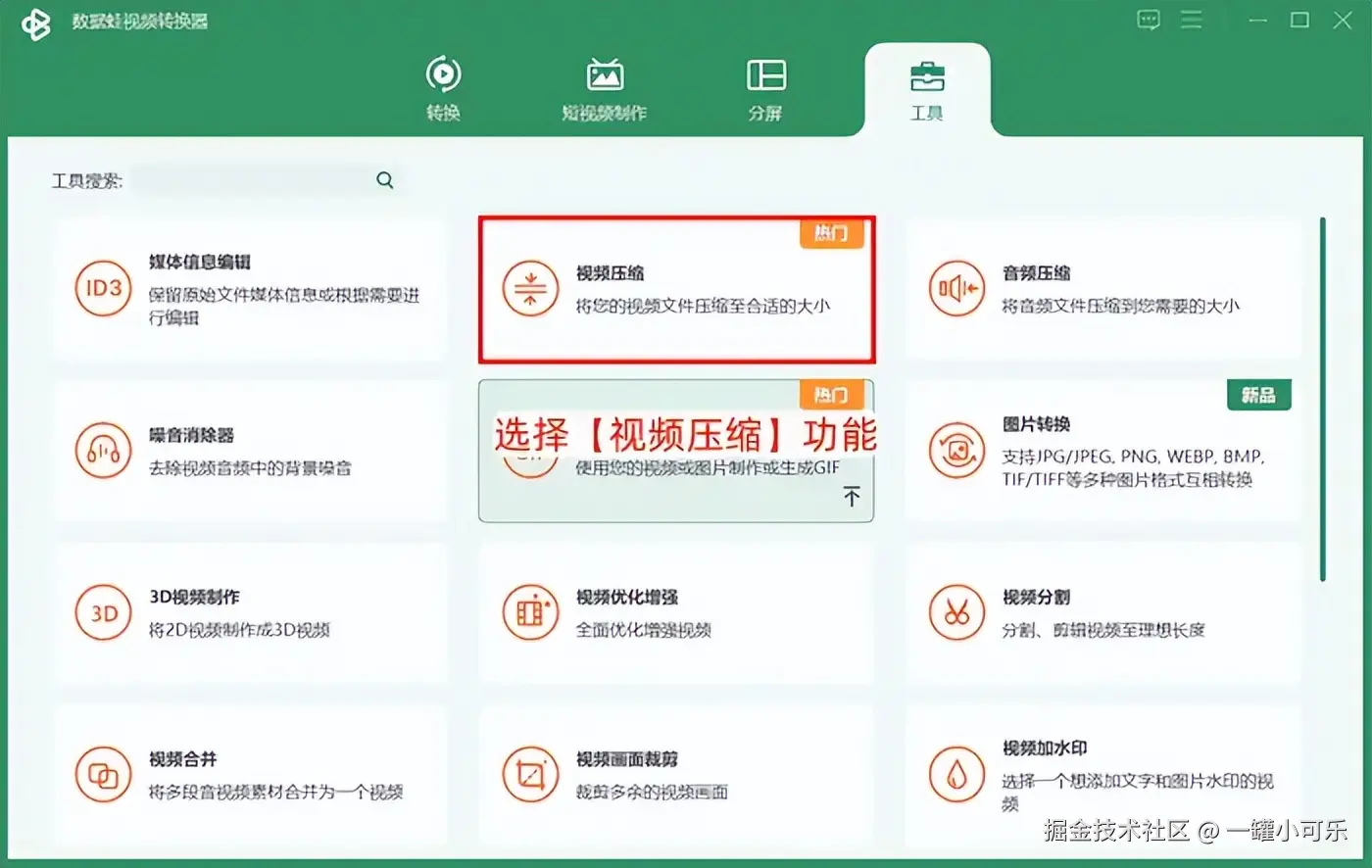 步骤1:打开该视频压缩应用,在视频工具箱选项下,选择【视频压缩】功能。