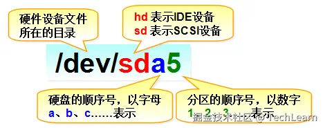 首先,/dev/目录中保存的应当是硬件设备文件;其次,sd表示是存储设备;然后,a表示系统中同类接口中第一个被识别到的设备,最后,5表示这个设备是一个逻辑分区。一言以蔽之,“/dev/sda5”表示的就是“这是系统中第一块被识别到的硬件设备中分区编号为5的逻辑分区的设备文件”。