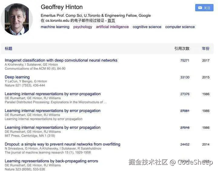 除此之外,Hinton还在卷积神经网络(Convolutional Neural Networks,CNN)、深度置信网络(Deep Belief Networks,DBN)、递归神经网络(Recursive Neural Networks,RNN)、胶囊网络(Capsule Network)等领域做出了重要贡献。
