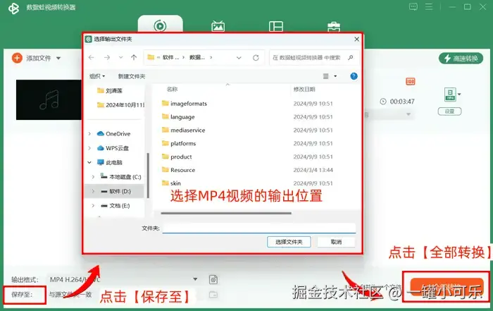 步骤3:完成相关的参数设置后,点击 【保存至】 ,选择MP4视频的输出位置,点击 【全部转换】 即可。