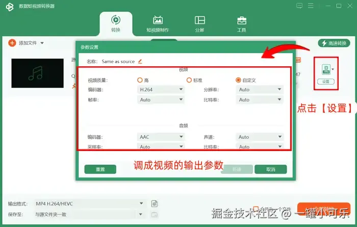 步骤2:点击 【设置】 ,调整视频的输出参数,如比特率等。