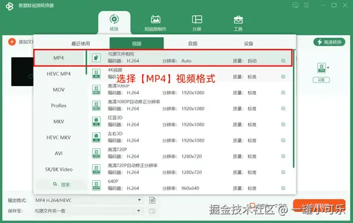 步骤1:在视频格式转换界面上,导入QSV视频文件并打开视频输出格式列表,选择 【MP4】 视频格式。