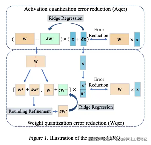 相互纠缠的 δx 和 δW 使得找到公式 4 的最优解变得具有挑战性。为使问题变得可处理,将公式 4放宽为两个顺序的子问题,通过分别最小化来自量化激活和权重的误差。如图1所示,首先进行激活量化误差减少 (Aqer),然后进行权重量化误差减少 (Wqer)。