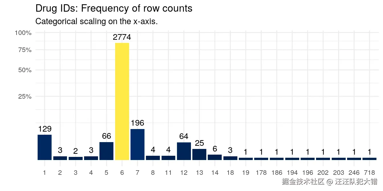 labs(x = "", y = "", title = "Drug IDs: Frequency of row counts", subtitle = "Categorical scaling on the x-axis.")
