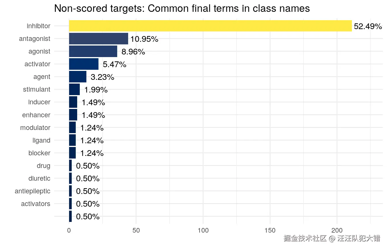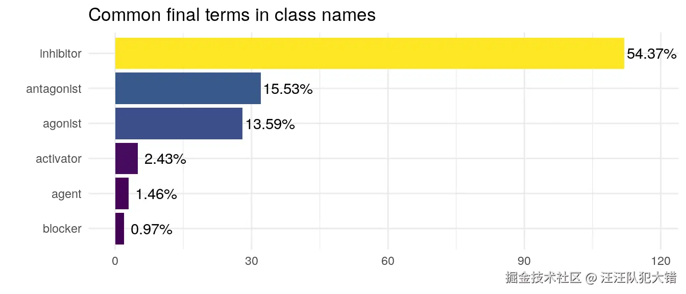 - 所有出现的数量超过100行的数据都是唯一的。对应于上图33中排名靠前的药物。