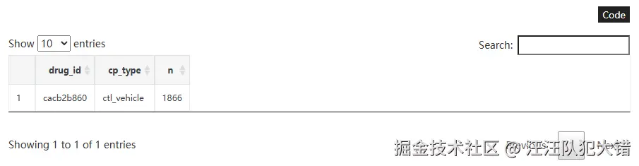 现在,大约8%的行听起来像是一个熟悉的数字。如果你一直到这本笔记本的开头你会发现1866的实际行数。是的,这些是对照治疗。因此,“cacb2b860”应该对应于cp_type ==“ctl_vehicle”。我们来确保这是正确的。下表应该只包含1行ctl_vehicle的1866条记录: