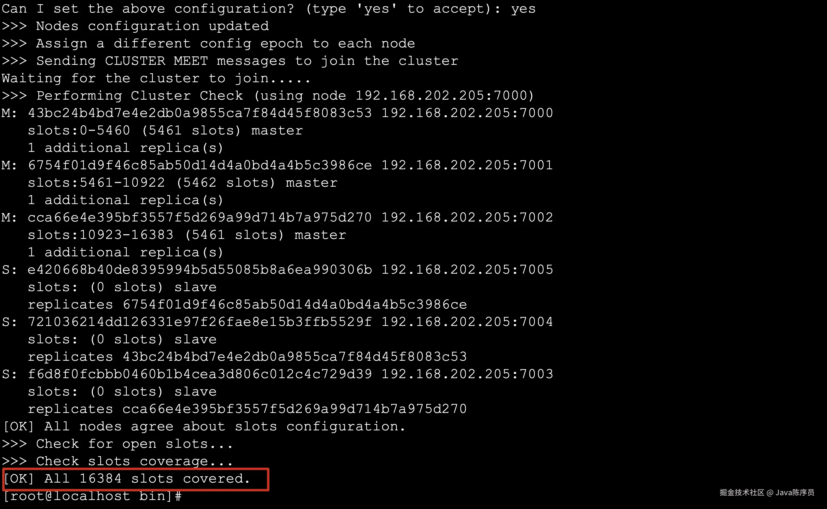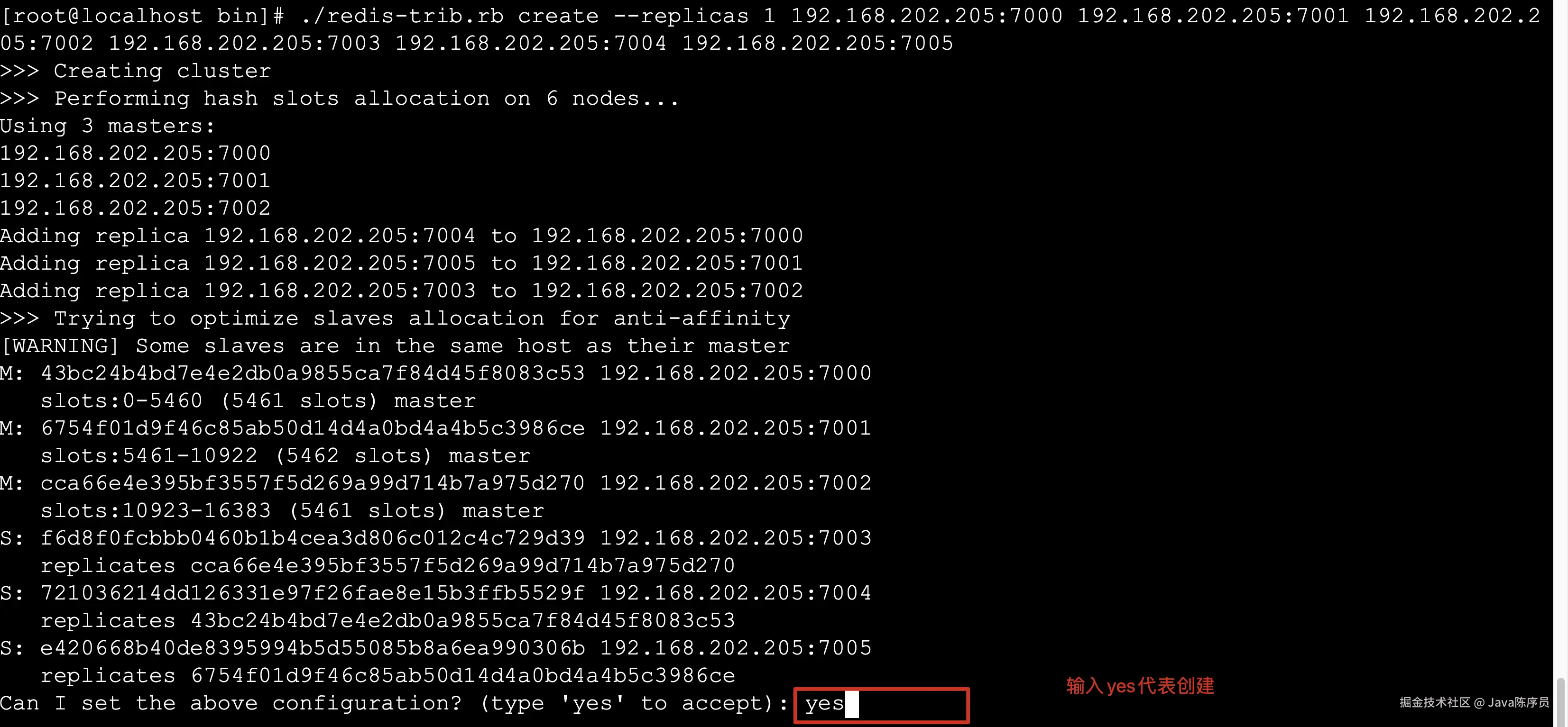 ./redis-trib.rb create --replicas 1 192.168.202.205:7000 192.168.202.205:7001 192.168.202.205:7002 192.168.202.205:7003 192.168.202.205:7004 192.168.202.205:7005
