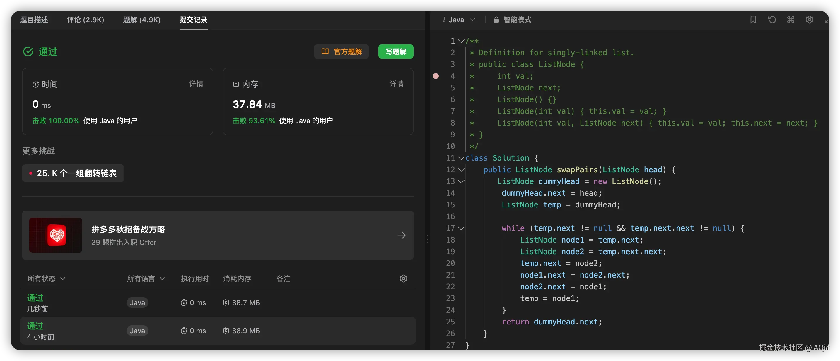 输入: head = [1,2,3,4]输出: [2,1,4,3]