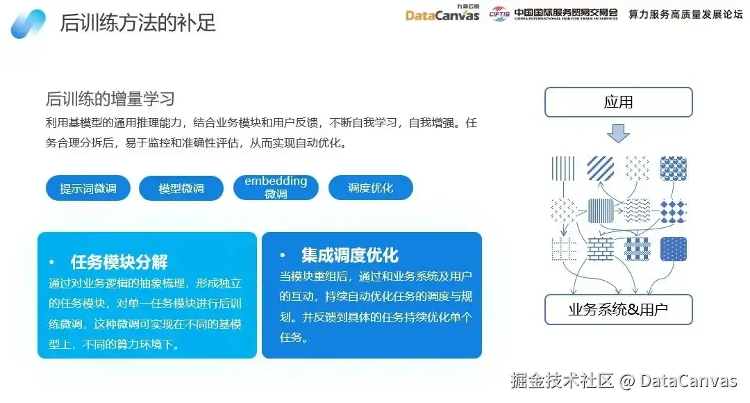 具体而言,大模型后训练的过程如下:将复杂的业务逻辑梳理并封装成独立的、可管理的任务模块;随后针对每个单一任务模块实施精准的后训练微调,以增强其针对特定任务的适应性和性能。在完成模块集成重组后,结合业务系统及用户的互动反馈,持续进行自我学习和自我增强,最终实现模型性能自动、高效的持续提升。