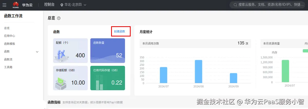 在浏览器打开FunctionGraph主页:www.huaweicloud.com/product/fun…,点击“开始使用”并登录,区域选择“北京四”。