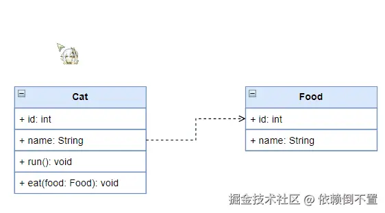 依赖关系通常使用虚线和箭头表示,箭头指向被依赖的类,通常一个类的方法如果以另一个类为参数,或者使用了另一个类,那么说明这个类依赖于另一个类。