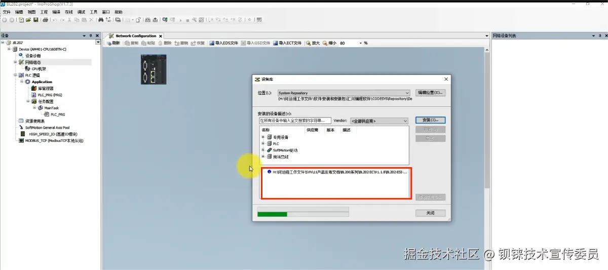 快速入门:使用钡铼BL202模块扩展汇川PLC 钡铼技术宣传委员 2024-10-16 157 阅读1分钟 钡铼技术BL202EtherCAT分布式I/0如何对接汇川PLC? 一、在PLC的编程软件新建工程 选择对应CPU 输入对应的名称 点击确定 双击网络组态 选择工具 选择设备库 选择安装钡铼技术BL202 ESI文件 文件导入成功 从右侧将IO模块拖入编程界面 至此添加结束 操作完成 谢谢您的观看