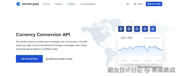 货币 API 提供免费的 API 密钥,每月赠送您 300 个免费积分。