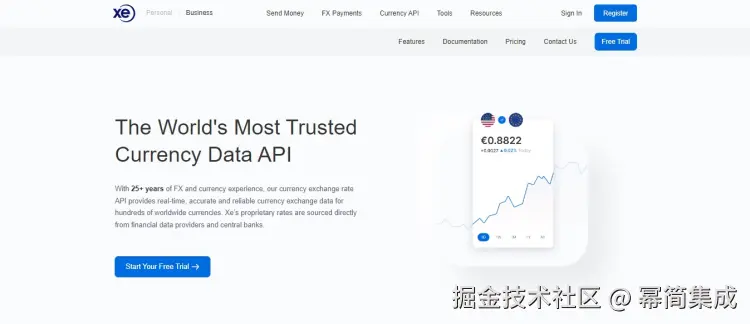 XE 的货币数据 API 多年来一直为开发者提供服务。您可以轻松地将其集成到不同的应用程序中,如 Microsoft Dynamics、Sage 和 SAP。该 API 允许您轻松地进行时间段查询。此外,它还提供了广泛的文档,详细解释了所有功能。