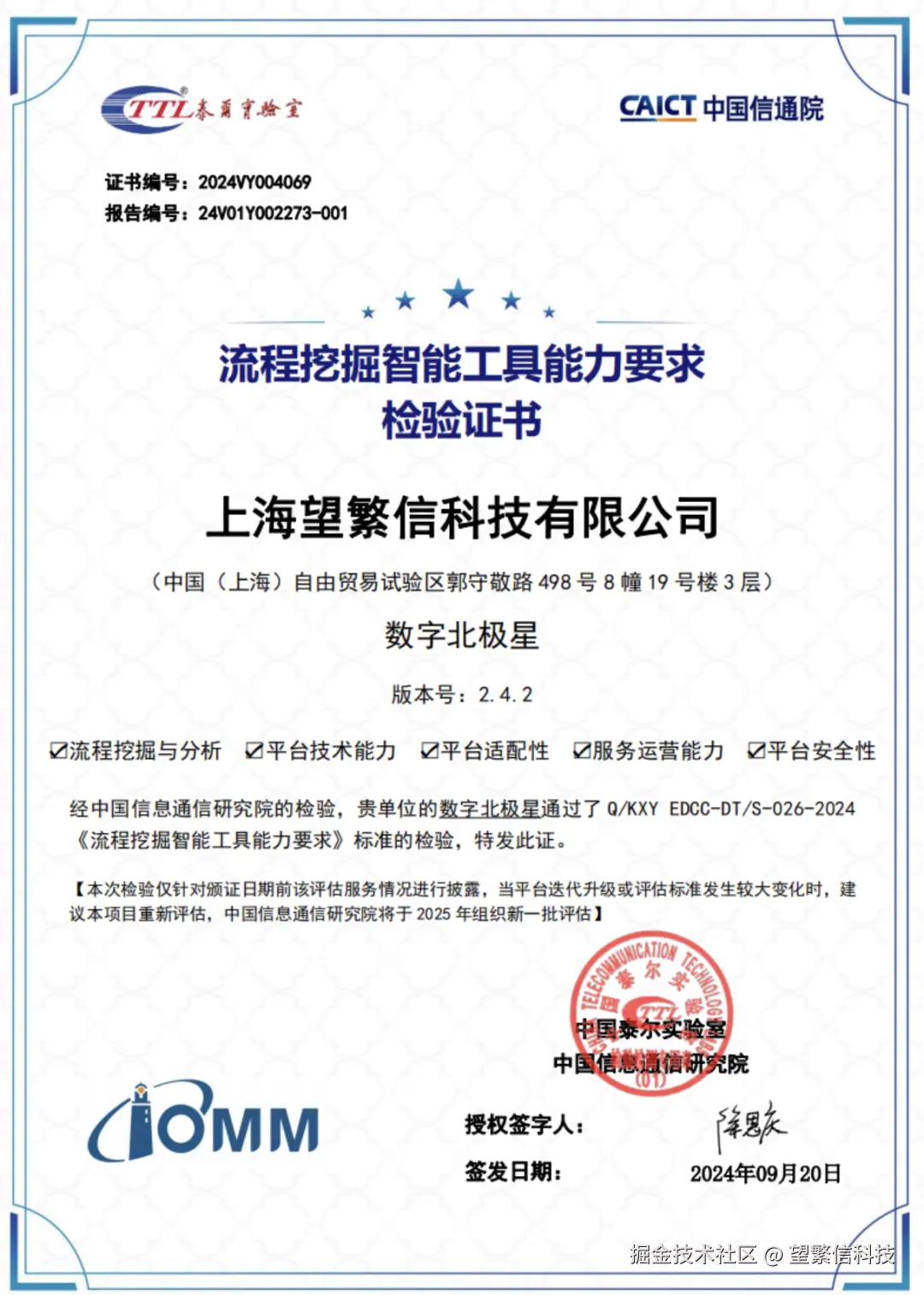 近日,上海望繁信科技有限公司(简称“望繁信科技”)成功通过中国信息通信研究院(以下简称“信通院”)IOMM数智化转型评估,荣获流程挖掘智能工具能力要求检验证书。这标志着望繁信科技在流程挖掘和流程智能领域的权威性得到了行业的广泛认可。