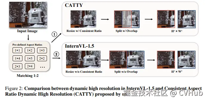 众所周知,将高分辨率图像提供给视觉语言模型有利于捕捉细粒度细节和减少幻觉。与 LLaVA-Next 和 InternVL-1.5 中的动态高分辨率不同的是,我们在对高分辨率图像进行切分时保持了图块的纵横比。在InternVL-1.5 中,在分割图像之前,图像大小会被调整为预定义分辨率中与其最接近的目标分辨率,这种切图方式容易导致失真。而我们通过在切图时引入 overlap 的方式在把图像切割为固定大小图块的同时,保持了图块纵横比。