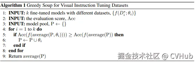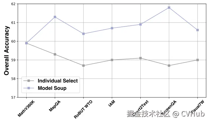 视觉指令调优数据对于现有视觉语言模型的卓越性能至关重要。但现有工作大多通过迭代消融来选择更有效的数据集,这种方法很快会达到一个瓶颈期,后续的数据选择带来的提升就会减小,甚至会降低性能。要改善选择逻辑遇到瓶颈后,我们使用 model soup 整合使用不同特性调优数据集进行微调的模型优参。model soup 的原理是通过使用不用的模型参数(学习率、数据增强、初始化等)来调优模型。对模型进行调优后,这些模型的优参被保留,所有选择模型的权重进行组合,以得到更强的模型。