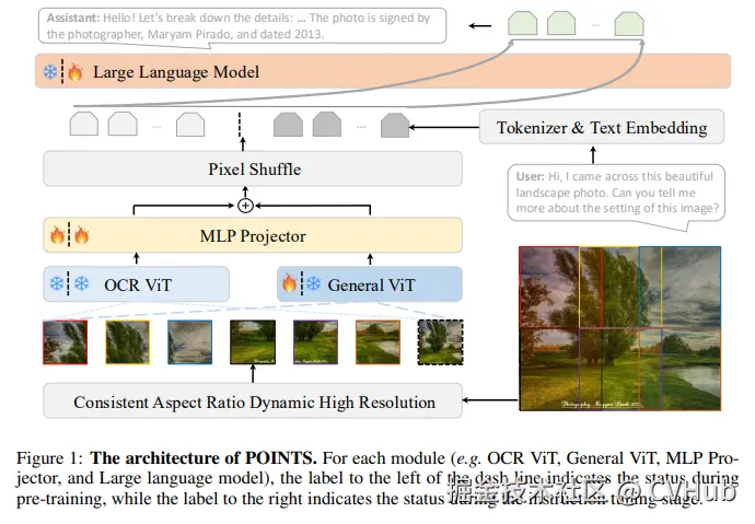 上图是POINTS的模型结构。对于每个模块(例如 OCR ViT、General ViT、MLP Projector 和 Large Language Model),虚线左侧标签表示预训练时的状态,右侧标签表示指令调优时的状态。