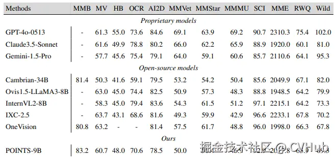除了 OpenCompass 的8个基准外,我们增加了ScienceQA、MME、LLaVA-Wild 和 ReadWorldQA 更详细地与目前领域内最先进的模型进行比较。POINTS的性能可与现有类似尺寸的模型媲美,甚至超越更大参数量的模型性能,如 Cambrian-34B。此外,与其他模型相比,POINTS 使用的预训练数据集和指令调优数据集更少且是公开可用的,我们下面将从各角度对 POINTS 进行了彻底的分析,充分论证每种策略的有效性。这意味着后续开源工作能够更简单直接地使用本文提出的方法。