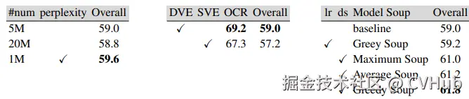 通过PPL筛选预训练数据的实验(左),Dual Vision Encoder 的实验(中),model soup 融合指令调优数据的实验(右)