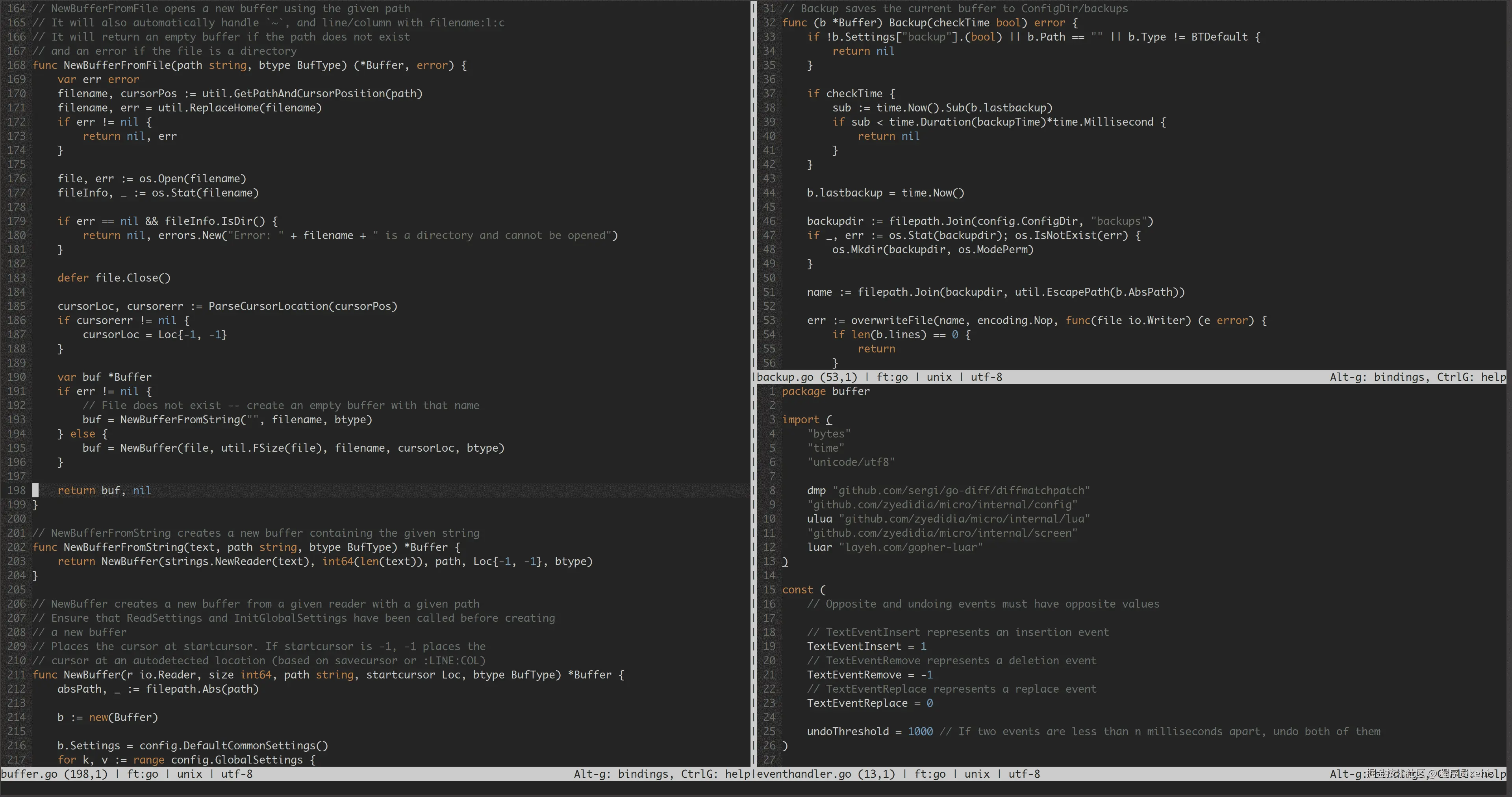 - 语法高亮和主题方案:支持超过 130 种语言,并有 7 种默认配色方案可供选择。Micro 支持 16、256 和 Truecolor 主题。语法文件和配色方案也非常简单。