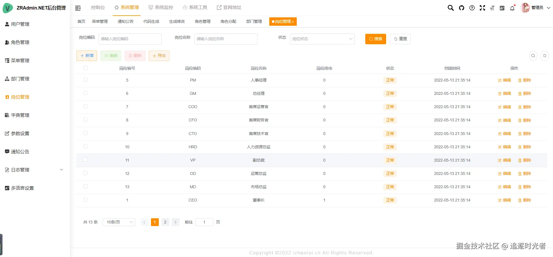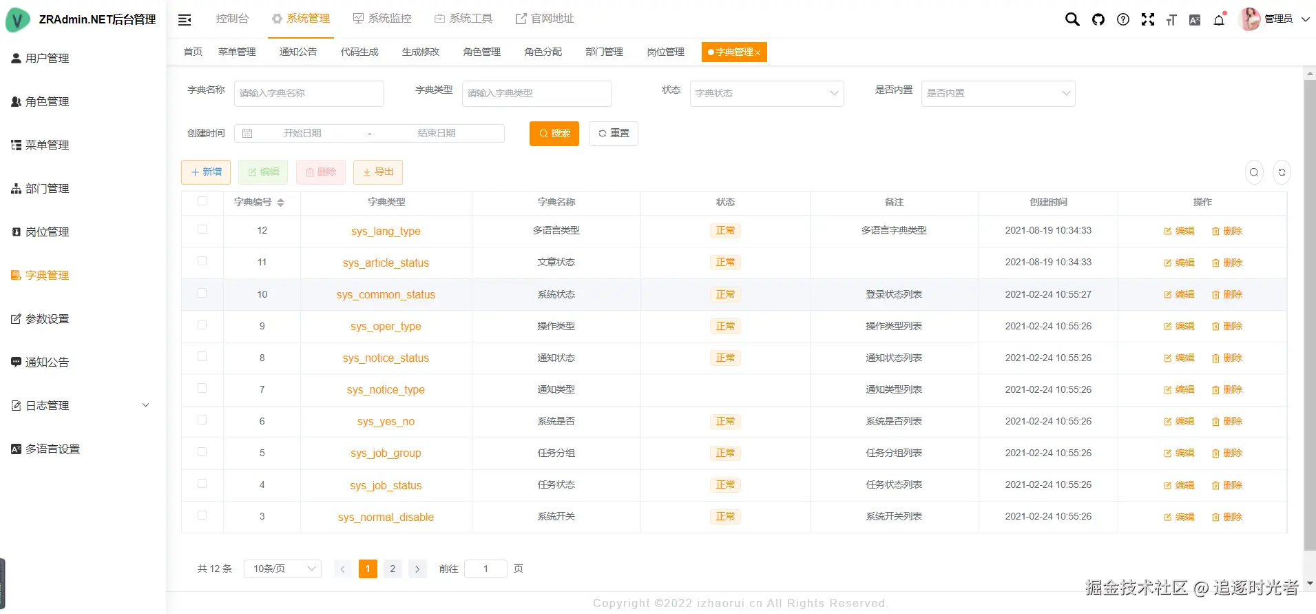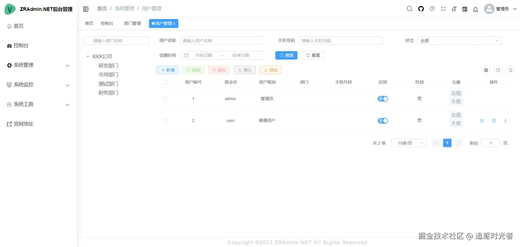系统内置了用户管理、部门管理、岗位管理、菜单管理、角色管理、字典管理、操作日志、登录日志等多种功能,满足一般后台管理系统的需求。