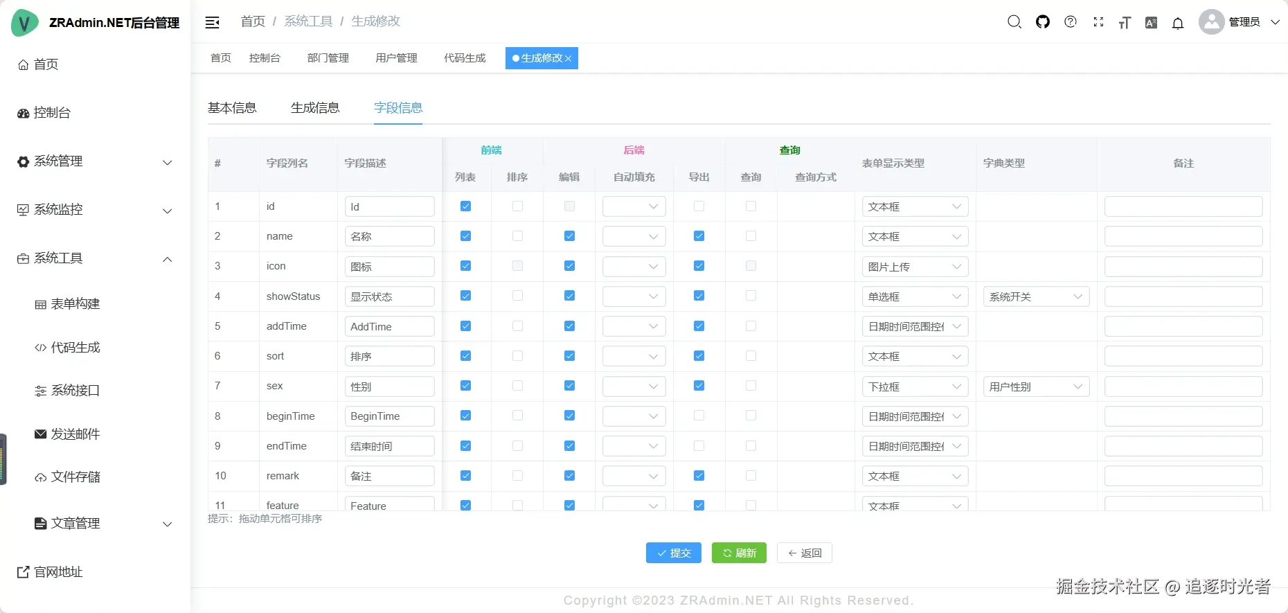 - 高效开发工具:提供了一键生成前后端代码的代码生成器,大大降低了开发工作量,同时支持在线构建器(仅支持Vue2),方便快速开发。
