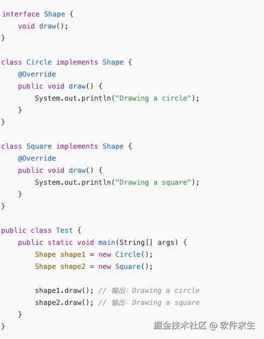 通过接口实现多态,Circle 和 Square 都实现了 Shape 接口,但它们在调用 draw() 方法时,表现出来的行为是不同的。