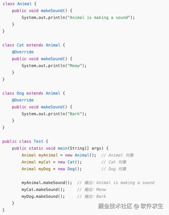 在这个例子中,虽然 myAnimal、myCat 和 myDog 都是 Animal 类型的引用,但实际调用时,它们执行的是各自类中重写的 makeSound() 方法。这就是多态的体现。