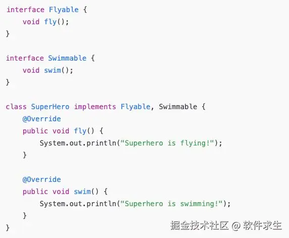 这里的 SuperHero 同时实现了 Flyable 和 Swimmable 接口,表现出飞行和游泳的能力。这样,继承父类的单一性不再是限制,我们可以让类具有多种不同的功能。