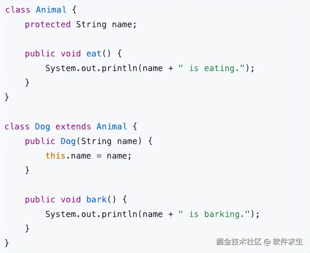在这个例子中,Dog 类继承了 Animal 类。Dog 类不仅可以复用 Animal 类中的 eat() 方法,还能添加它自己的 bark() 方法。通过继承,我们可以提高代码的复用性,避免写重复的代码。